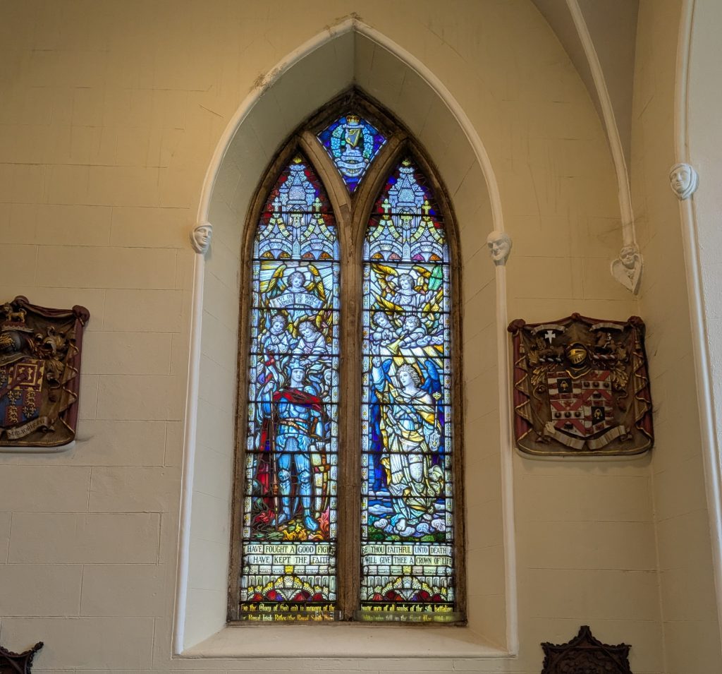 In the cathedral of Downpatrick in Northern Ireland, there is a remembrance window for the soldiers of all ranks of the Fifth Battalion of the Royal Irish Rifles (the Royal South Down). It depicts angels adjusting the helmet of a soldier in full armour with the words ‘put on the whole armour of God’ Underneath you can read the words, ‘I have fought a good fight. I have kept the faith. Be thou faithful until death and I will give thee a crown of life.’ And to illustrate this a large angel (maybe St Michael?) is pointing heavenwards.
