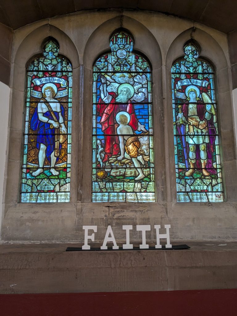 One wonders, looking at the window today, whether these images are a reference to a significant other in the life of Major Lloyd Thompson which his parents wanted to allude to. Maybe a significant other who had also died in war. Or whether this was also a reference to the young warriors who fought and were killed on the other side whose young lives were also full of promise as the lives of the young men from our own community who were killed. We can’t possibly know this, the meaning of the images is ambiguous but also powerful as it opens our minds to reflect on an actual life brought to an abrupt and violent end. As it happens, the word ‘love’ is written underneath the picture of Jonathan. David on the other side of the window has ‘valour’ written under him. And the central window has the word ‘sacrifice’.